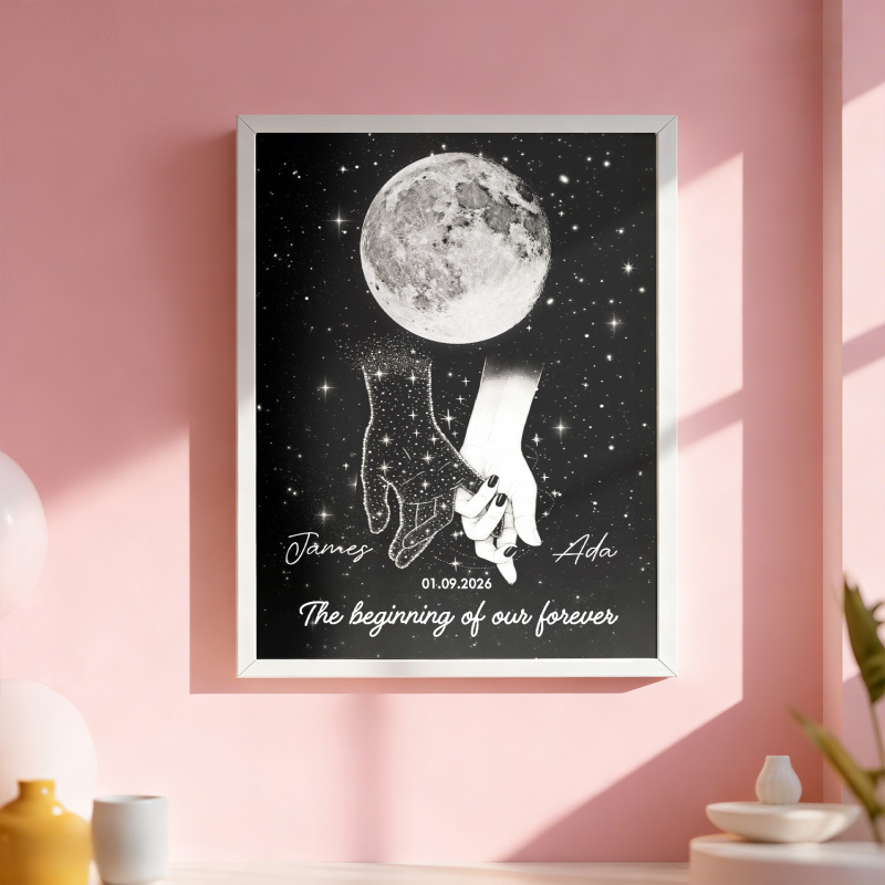Galaxy Night Couple Holding Hands Custom Moon Phase Anniversary Date - Personalized Poster - Heartfelt Anniversary Gift, Valentine Gift, Wedding Gift For Couple
